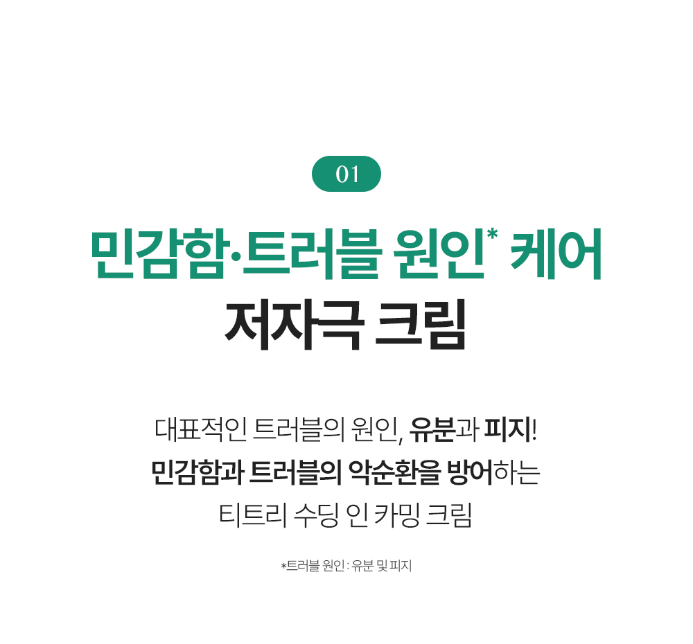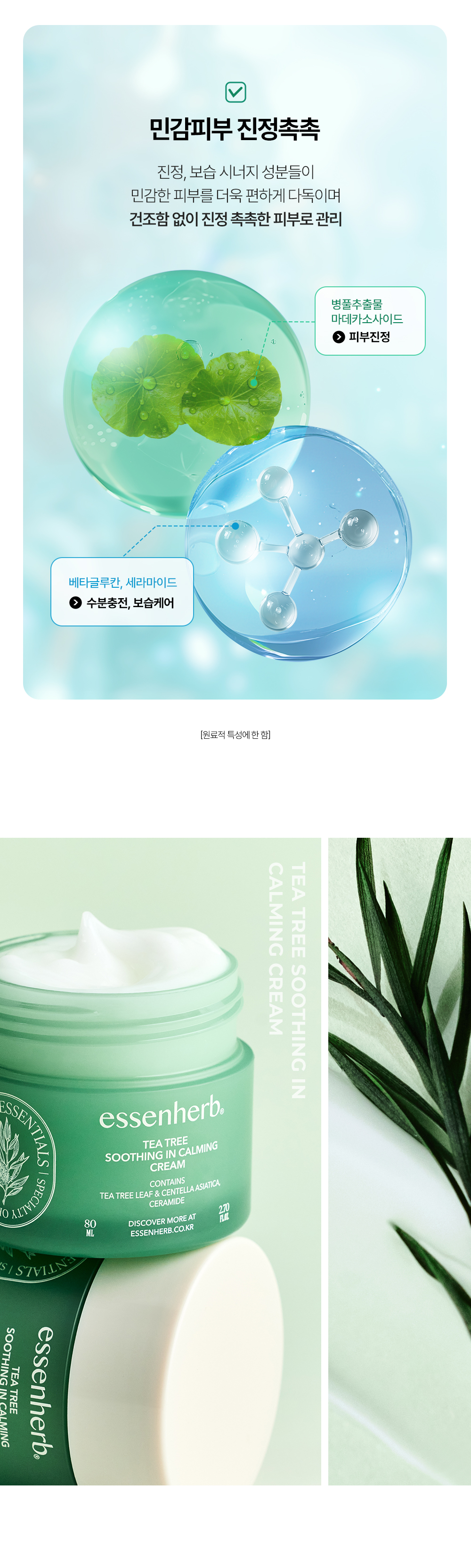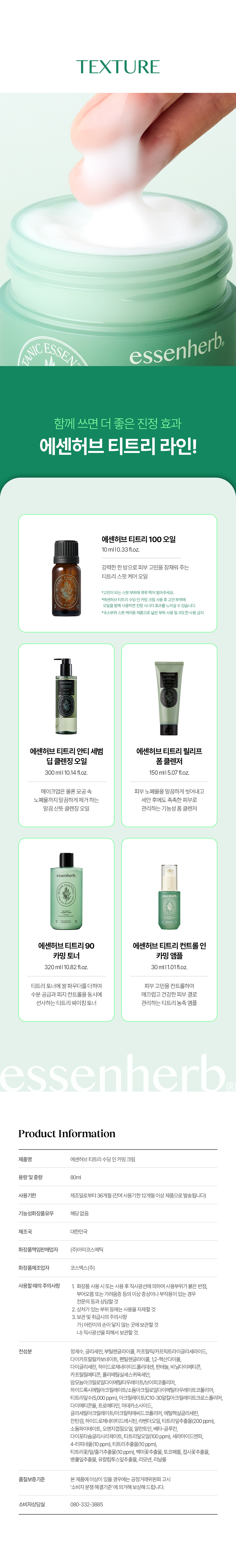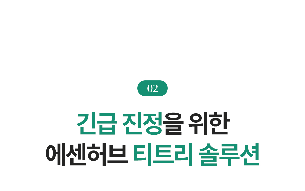 정제수, 글리세린, 부틸렌글라이콜, 카프릴릭/카프릭트라이글리세라이드, 다이카프릴릴카보네이트, 펜틸렌글라이콜, 1,2-헥산다이올, 다이글리세린, 하이드로제네이티드폴리데센, 판테놀, 비닐다이메티콘, 카프릴릴메티콘, 폴리메틸실세스퀴옥세인, 암모늄아크릴로일다이메틸타우레이트/브이피코폴리머, 하이드록시에틸아크릴레이트/소듐아크릴로일다이메틸타우레이트코폴리머, 티트리잎수(5,000 ppm), 아크릴레이트/C10-30알킬아크릴레이트크로스폴리머, 다이메티콘올, 트로메타민, 마데카소사이드, 글리세릴아크릴레이트/아크릴릭애씨드코폴리머, 에틸헥실글리세린, 잔탄검, 하이드로제네이티드레시틴, 라벤더오일, 티트리잎추출물(200 ppm), 소듐파이테이트, 오렌지껍질오일, 알란토인, 베타-글루칸, 다이포타슘글리시리제이트, 티트리잎오일(100 ppm), 세라마이드엔피, 4-터피네올(10 ppm), 티트리추출물(10 ppm), 티트리꽃/잎/줄기추출물(10 ppm), 백미꽃추출물, 토코페롤, 접시꽃추출물, 병풀잎추출물, 유칼립투스잎추출물, 리모넨, 리날룰