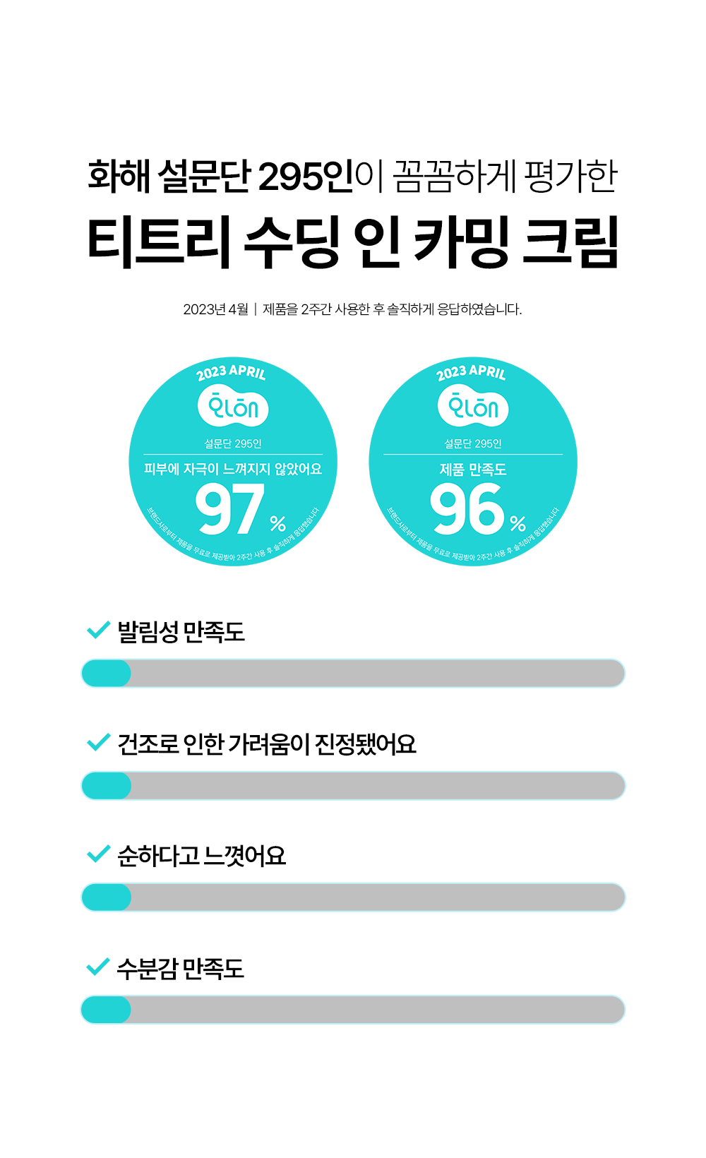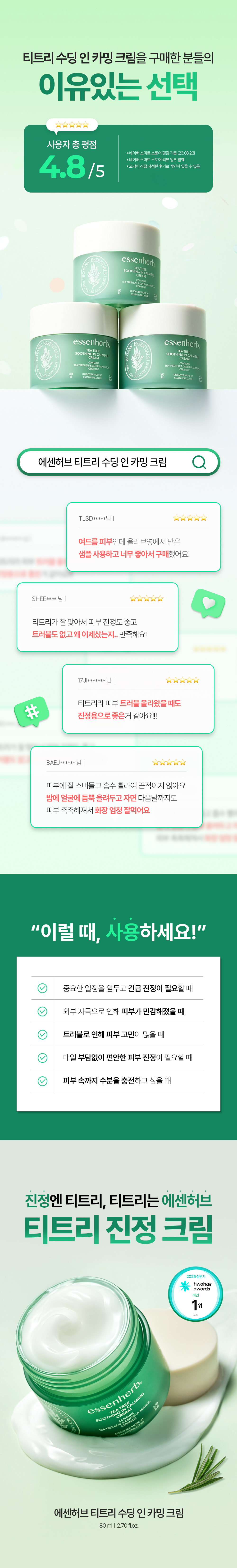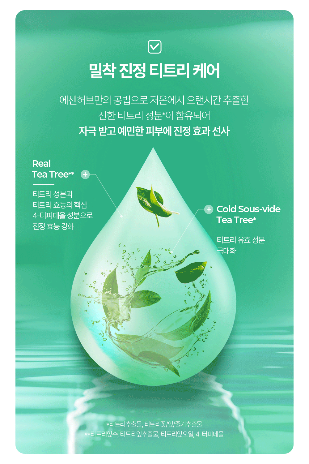 정제수, 글리세린, 부틸렌글라이콜, 카프릴릭/카프릭트라이글리세라이드, 다이카프릴릴카보네이트, 펜틸렌글라이콜, 1,2-헥산다이올, 다이글리세린, 하이드로제네이티드폴리데센, 판테놀, 비닐다이메티콘, 카프릴릴메티콘, 폴리메틸실세스퀴옥세인, 암모늄아크릴로일다이메틸타우레이트/브이피코폴리머, 하이드록시에틸아크릴레이트/소듐아크릴로일다이메틸타우레이트코폴리머, 티트리잎수(5,000 ppm), 아크릴레이트/C10-30알킬아크릴레이트크로스폴리머, 다이메티콘올, 트로메타민, 마데카소사이드, 글리세릴아크릴레이트/아크릴릭애씨드코폴리머, 에틸헥실글리세린, 잔탄검, 하이드로제네이티드레시틴, 라벤더오일, 티트리잎추출물(200 ppm), 소듐파이테이트, 오렌지껍질오일, 알란토인, 베타-글루칸, 다이포타슘글리시리제이트, 티트리잎오일(100 ppm), 세라마이드엔피, 4-터피네올(10 ppm), 티트리추출물(10 ppm), 티트리꽃/잎/줄기추출물(10 ppm), 백미꽃추출물, 토코페롤, 접시꽃추출물, 병풀잎추출물, 유칼립투스잎추출물, 리모넨, 리날룰